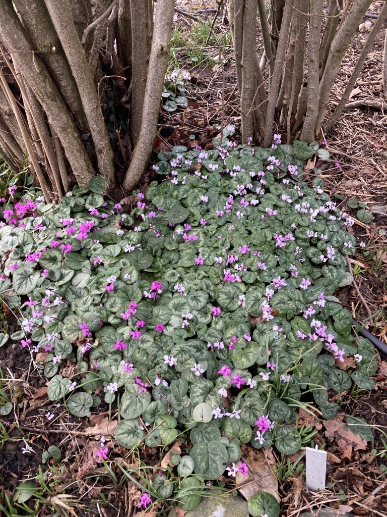 - Début de floraison des primevères, cyclamen de Naples (Cyclamen hederafolium), primevères, euphorbia foetida, perce-neige.