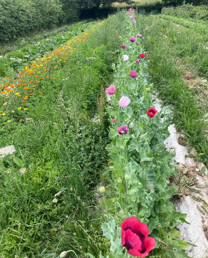 Le jardin d’Opus accueille les grandes plantes qui composent nos infusions — mélisse, menthes, cassis, calendula, verbascum, valériane, etc. Elles y sont cultivées en rotation, avec une attention constante portée à la vitalité du sol. Nous privilégions une approche douce et cohérente : les plantes soignent les plantes, par des préparations et des associations favorisant l’équilibre naturel et la régénération de la terre. La pose de couvre sol en chanvre nous permet d’éviter un fastidieux déserbage entre les rangs et surtout de préserver une humidité en été qui évite de recourir à l’arrosage. Ce dernier est pratiqué 2 à 3 fois par an pour maintenir une humidité en sous-sol.
