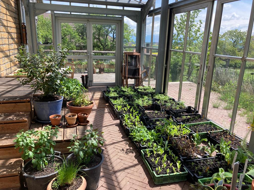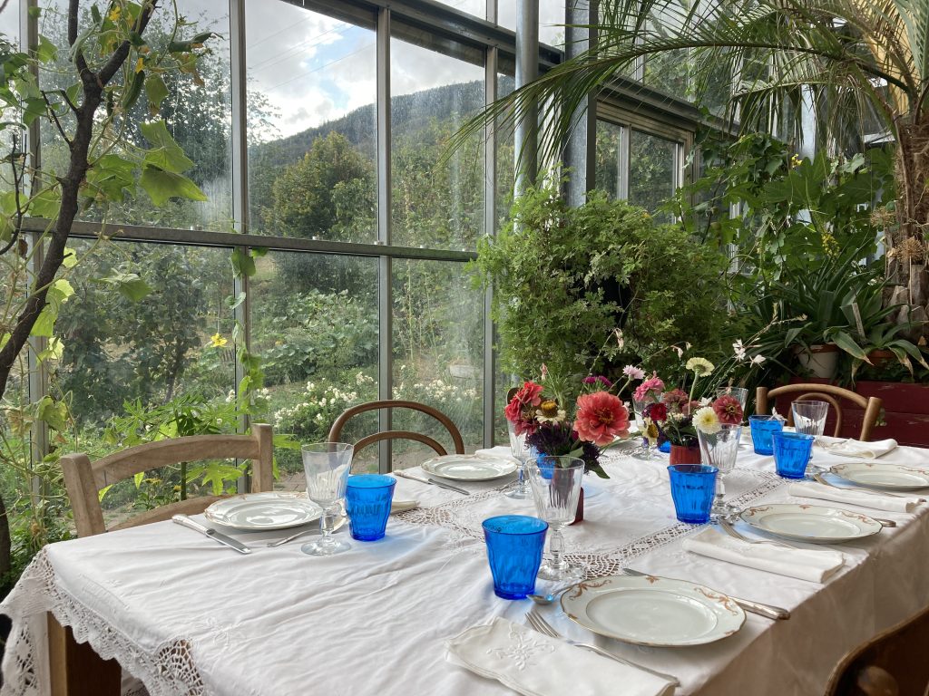 Conçue comme un véritable tampon thermique, qui contribue à environ 30 % au chauffage de la maison, la serre accueille les semis au printemps, offre un espace d’hivernage aux verveines et abrite une belle collection de pélargoniums odoroants et autres spicment d’Afrique du Sud. À la fois outil de culture et lieu de transition entre les saisons, elle relie le jardin à l’habitat dans une logique d’équilibre et d’autonomie.