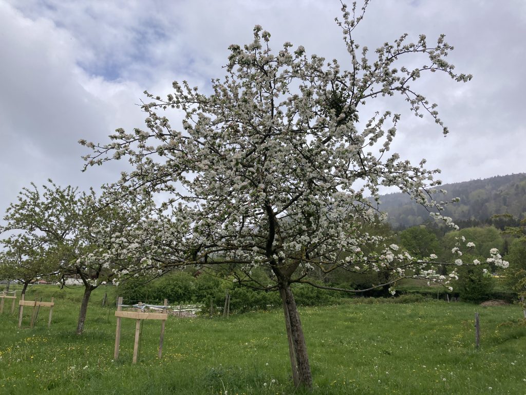 Le verger, planté en 2005, a été densifié en 2023 pour faire face aux vents plus forts et aux effets du réchauffement climatique. Les arbres — pommiers, poiriers, figuiers, mais aussi bouleaux, frênes, aubépines — poussent désormais en synergie, formant une trame protectrice pour les cultures. Pour soutenir les auxiliaires, nous avons installé des nichoirs et des perchoirs à rapaces, favorisant ainsi un équilibre naturel au sein du verger. Une quarantaine de vieilles variétés de développe dans un environnement plus exigeant que celui des plaines du Rhône.