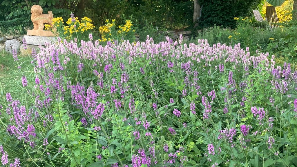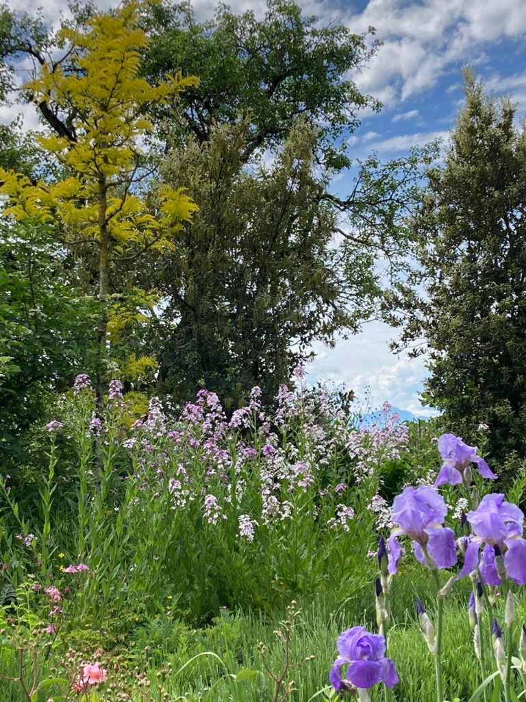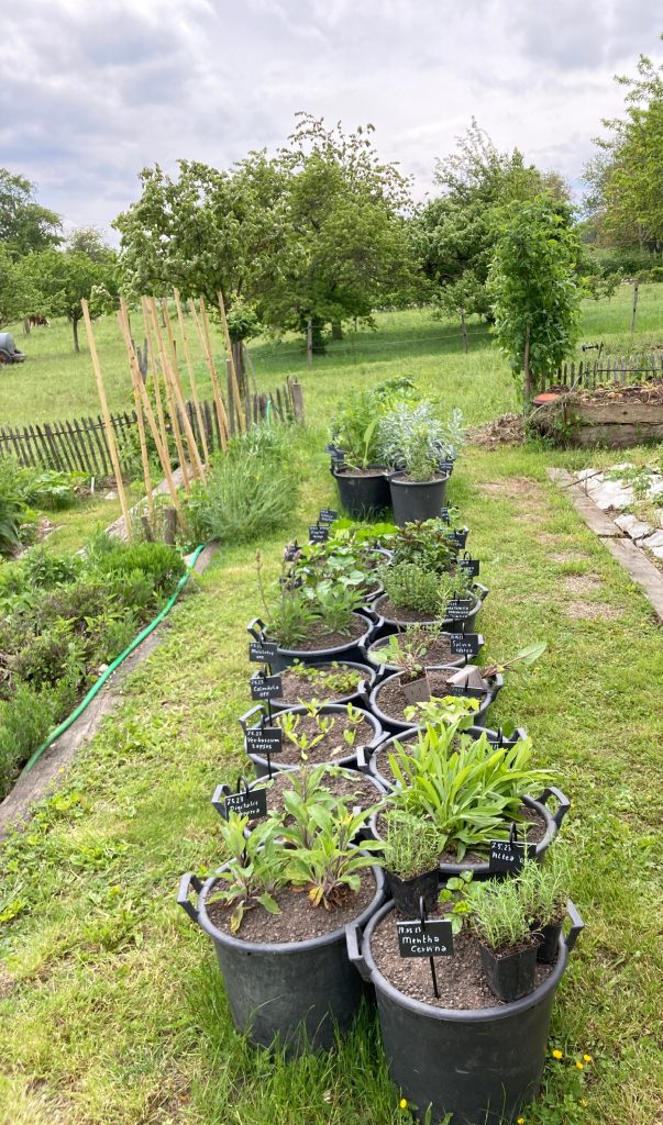 Le jardin de l’abbaye de Saint-Gall, né au IXᵉ siècle, dessinait un monastère vivant et autosuffisant : potager nourricier, herbularius soignant, verger généreux — chaque espace au service du vivant et de la communauté. Au Jardin des Ochettes, cet esprit se prolonge dès 2013 : sous les sureaux et les noisetiers, les légumes d’été côtoient les simples médicinales. Un lieu où l’on cultive à la fois la terre, le soin et le lien. Démarré dans le stricte respect des plans de l’abbaye, le Jardin a dérivé, la rue est toujours en place mais la menthe -coq – Tanacetum balsamita ne parvient pas à rester en place, tous les 2 ans , elle se doit de trouver une autre place, en 2025 elle était dans le jardin social et en rangs sages dans le Jardin d’Opus! Le poivirer du Sichuan Zanthoxyllum piperita est lui venu ombrer les ancolies Aquilegia vulgaris, l’Ecalyptus globulus planté en 2019 frise les 7 mètres de haut, bref chacun trouve sa place, sauf les moines qui ne retrouverait pas leur méticuleuse gestion des simples.