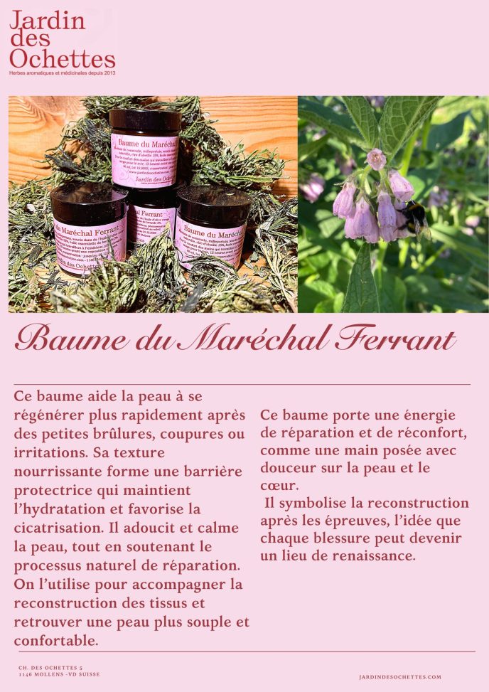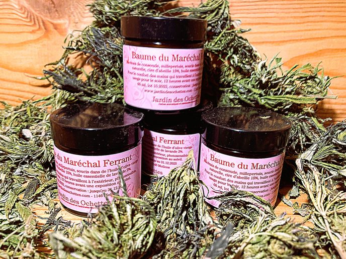 Depuis des années le baume du Maréchal Ferrant nous accompagne tout au long de nos travaux et loisirs d’extérieurs. Protection des mains, il est efficace contre les crevasses, petites lésions de la peau, assouplissement des articulations, brûlures légères.