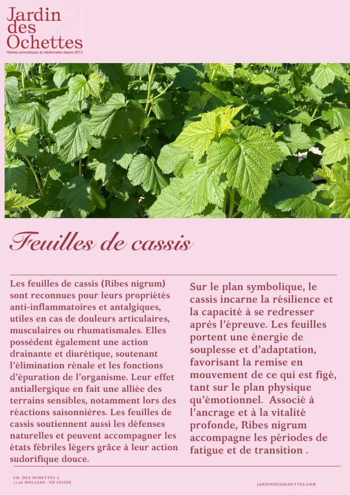 La feuille de cassis est une magnifique surprise en infusion En quelques minutes, l’infusion devient rouge sang et un arôme subtil et bienfaisant s’installe.